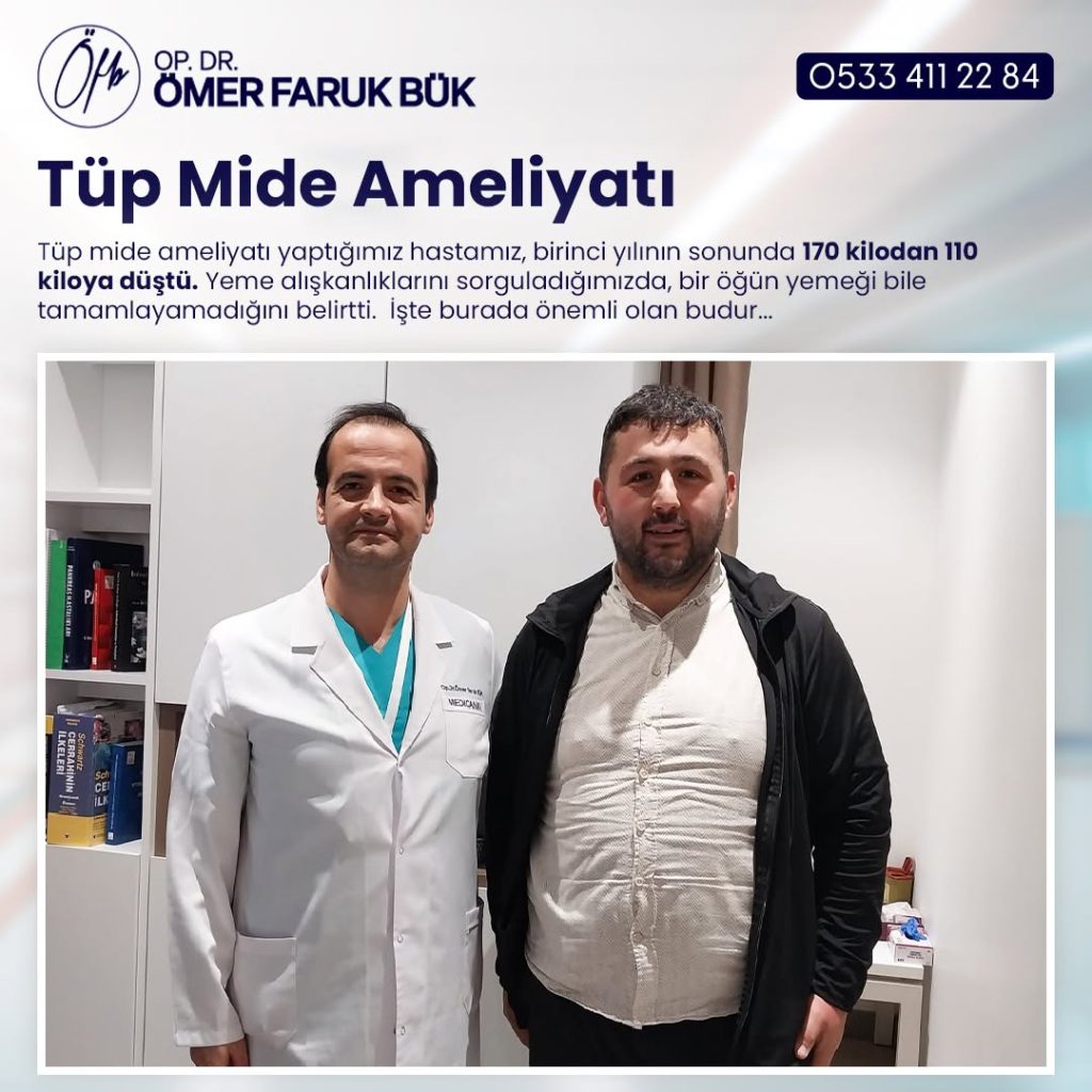 Tüp mide ameliyatı yaptığımız hastamız, birinci yılının sonunda 170 kilodan 110 kiloya düştü. Yeme alışkanlıklarını sorguladığımızda, bir öğün yemeği bile tamamlayamadığını belirtti.